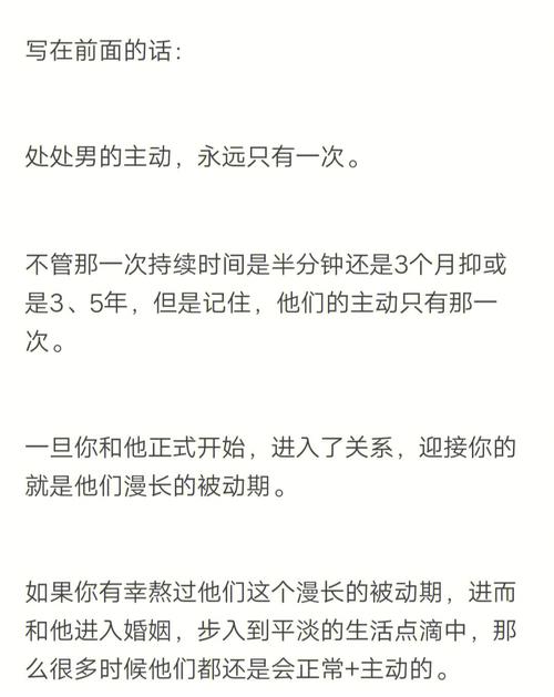 感情被动男生并非没有感情,只是他们在表达情感方面存在一定的问题。通过了解、关心和鼓励,我们可以帮助他们走出被动,勇敢地面对感情。